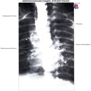 Посмертная рентгенография младенца с атрезией трахеи, ПЗ проекция: определяется введение контрастного вещества через катетер в просвете органа, затеняющего пищевод и аномальные правый и левый бронхи, начинающиеся от боковых стенок пищевода. Считается, что атрезия трахеи обусловлена аномально вентральным положением примитивных трахеопищеводных складок с перекрыванием просвета развивающейся трахеи. Поскольку бронхи образуются из передней кишки, они сохраняют примитивное сообщение с пищеводом.