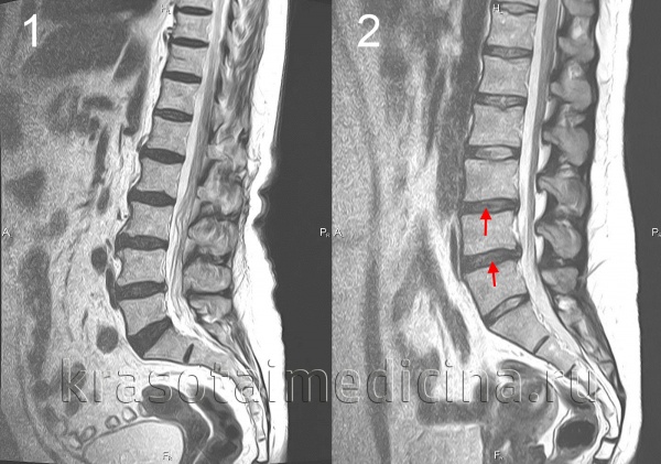 МРТ поясничного отдела позвоночника. 1- выраженная дегидратация межпозвонковых дисков во всех сегментах. 2- дегидратация в сегментах L3-L4, L4-L5 справа (разные пациенты)