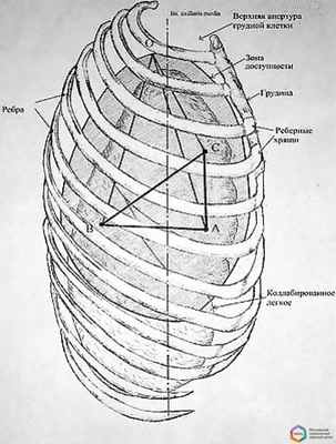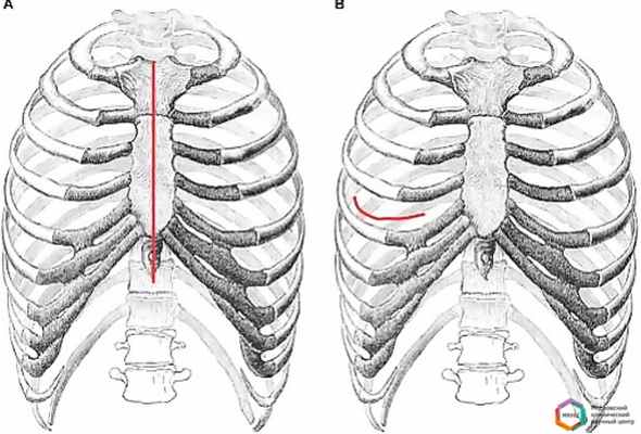 Но не все нейрогенные опухоли возможно удалить торакоскопическим доступом. В случае инвазии опухоли возникает необходимость выполнения комбинированных операций с резекцией или удалением вовлеченных в опухолевый процесс структур, что позволяет улучшить показатели резектабельности с 60-75 % до 85 % . В этом случае однозначно используется торакотомный (рисунок б), либо стернотомия (рисунок а), реже комбинированный стерно-торакотомный доступ.