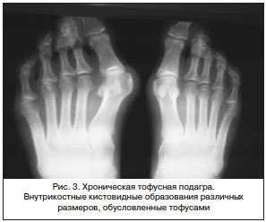 При остром артрите специфические изменения на рентгенограммах не выявляются. Характерные для подагры рентгенологические изменения развиваются обычно не ранее 3-х лет с начала заболевания. При этом одновременно можно наблюдать признаки деструкции, дегенерации и регенерации.