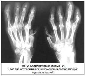 Мутилирующая форма ПА, как указывалось выше, проявляется тяжелыми остеолитическими изменениями составляющих суставов костей. Резорбции подвергаются не только эпифизы, но и диафизы костей суставов, вовлеченных в патологический процесс. Иногда поражение затрагивает не только все суставы кистей и стоп, но и диафизы костей предплечья (рис. 2).