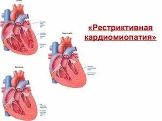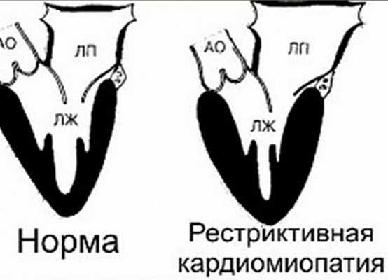 Рестриктивная кардиомиопатия – это (от лат. restrictio — ограничение) — первичное или вторичное поражение сердца, характеризующееся нарушением диастолической функции желудочков. Вследствие неконтролируемого образования фиброзных волокон в эндомиокарде происходит ограничение элластичности и подвижности стенок левого желудочка, что приводит к выраженному ограничению заполнения (рестрикции) желудочков в диастолу кровью.