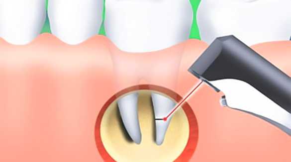 Операция резекции происходит путем отсечения верхушки корня зуба вместе с «гнойным мешочком» вращающимся инструментом.