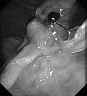Рис. 4. Доступ к желчевыводящим протокам с частичным заведением дуоденоскопа в просвет дивертикула.