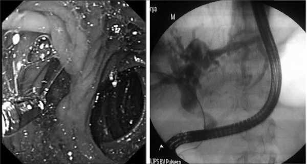 Следует отметить частое возникновение некоторых сложностей в интерпретации холангиограмм при наличии парапапиллярного дивертикула, что связано в первую очередь с невозможностью детальной оценки терминального отдела общего желчного протока из-за депо-тени контрастного вещества в полости дивертикула. Для объективной оценки дистального отдела общего желчного протока мы применяем метод аспирации контрастного вещества и инсуффлированного газа из полости дивертикула или используем специальные, запатентованные нами оригинальные катетеры для эндоскопической катетеризации и контрастирования желчных протоков (патент № 2459641 от 27.08.12).