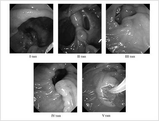 В 65 (15,4%) наблюдениях нами был выявлен I тип дивертикулов, при котором БСДК располагается в полости дивертикула, в 17 (4%) — II тип — БСДК располагается между двух дивертикулов, у 124 (29,3%) — III тип — БСДК располагается в области шейки дивертикула или за его пределами, при этом продольная складка ДПК переходит на стенку дивертикула, у 145 (34,3%) — IV тип — устье БСДК и продольная складка ДПК располагаются в области шейки дивертикула, у 72 (17%) — V тип — БСДК и продольная складка ДПК находятся за пределами дивертикула и его шейки.