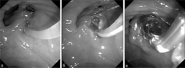 Все вмешательства выполняли под медикаментозной седацией. В сложных ситуациях для поиска БСДК использовали такие приемы, как пальпация и перемещение инструментом слизистой устья дивертикула, частичное заведение эндоскопа в просвет дивертикула, при наличии наружного дренажа использовали метод искусственной билиарной гипертензии, пробу с введением окрашенного раствора или методику «рандеву» с захватом струны.