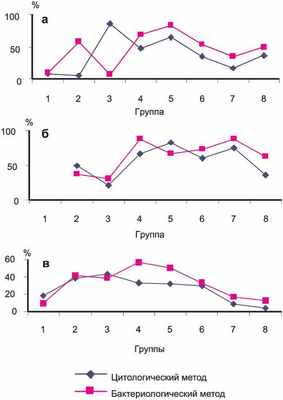 Грибы рода Candida намного чаще высеивались при бактериологических исследованиях в 4-й и 5-й группах, если сравнивать эти показатели с результатами цитологических исследований - 56,3 и 33,3% (4-я группа) и 50 и 32,1% (5-я группа) (см. рисунок, в).