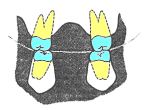 Плоскость, проходящая между резцовой точкой (точка контакта режущих краев обеих нижних и верхних центральных резцов) и самым высоким щечным бугорком второго моляра с обеих сторон нижней челюсти образует окклюзионную (жевательную) плоскость.