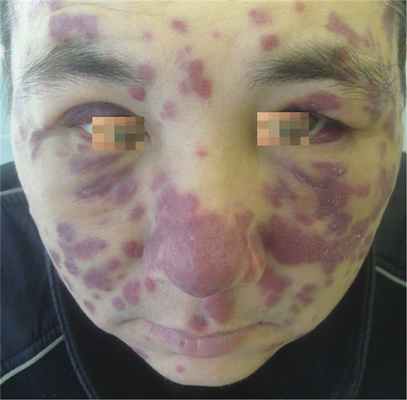 Болезнь обычно проявляется множественными фиолетовыми или синюшными пятнами неправильной формы, однако их расположение отличается: