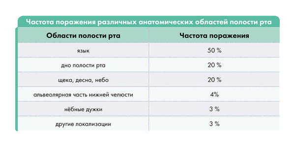 Большинство очагов онкологии наблюдается на языке. Чуть меньше злокачественных образований на дне полости рта. Рак мягкого и твердого неба, десен и щек выявляется в 20% случаев. Гораздо реже диагностируется поражение альвеол нижней челюсти – 4%, дужек неба, ретромолярной области и преддверия – 3%.