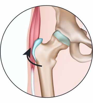 При сгибании ноги в тазобедренном суставе сухожилия сдвигаются и оказываются кпереди от большого вертела. Так как большой вертел слегка выступает, то при движении сухожилий относительно него можно услышать щелчок. Такое состояние может привести к бурситу тазобедренного сустава. Бурсит - это воспаление и утолщение синовиальной сумки: мешка с гладкими стенками, заполненного жидкостью, который обеспечивает беспрепятственное скольжение мышц относительно костей.