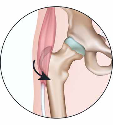 Синдром щелкающего бедра может быть вызван сухожилием прямой мышцы бедра, которая проходит по передней поверхности бедра и крепится к тазовой кости. При сгибании бедра сухожилие смещается относительно головки бедренной кости; при выпрямлении нижней конечности сухожилие возвращается в исходное положение. Эти возвратно-поступательные движения сухожилия по поверхности головки бедренной кости и вызывают щелчки.