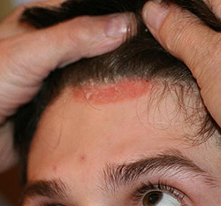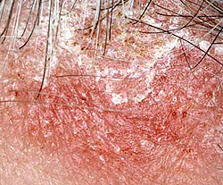Зачастую отмечается зуд и появляются пятна розового цвета с нечё ткими границами, которые покрыты тонкими хлопьями перхоти. Весь этот процесс может распространиться на участки кожи за пределами волосистой части головы.