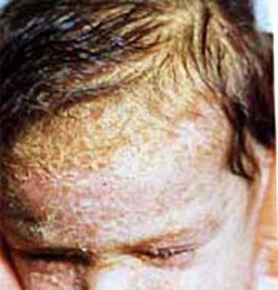 - приобретённая — краевой блефарит, себорейный дерматит наружного слухового прохода, пятнистый дерматит, асбестовидный лихен (шелушение кожи волосистой части головы).