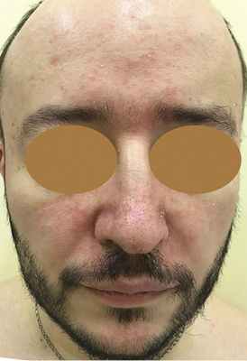 Патологический процесс в большинстве случаев симметричный, локализуется на участках кожи, богатых сальными железами, а именно на коже волосистой части головы, лица, заушной области, верхней части туловища и в крупных складках. Клиническая картина может варьировать в зависимости от локализации и тяжести течения заболевания. Так, при поражении волосистой части головы при легком течении может наблюдаться умеренное шелушение без признаков активного воспаления (рис. 1); в тяжелых случаях высыпания могут быть представлены инфильтрированными, крупными бляшками, покрытыми массивными желтыми чешуйко-корками, при отторжении которых визуализируется мокнущая поверхность. На коже лица и туловища высыпания чаще всего представлены четко ограниченными эритематозными пятнами, на поверхности которых отмечается шелушение (рис. 2, 3); возможно также присутствие инфильтрации, корок, мокнутия. Основными жалобами являются зуд, жжение, шелушение в области очагов [2, 5].