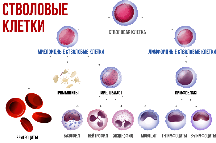 Ниже изображена упрощенная схема кроветворения. Гемопоэтическая (кроветворная) стволовая клетка дает начало миелоидной и лимфоидной клеткам-предшественницам, из которых в дальнейшем образуются все клетки крови. Как представлено на рисунке, плазматическая клетка образуется из В-клетки в костном мозге, а В-клетки – это производное лимфоидных предшественников. Поэтому множественная миелома является лимфопролиферативным заболеванием, то есть, в основе болезни лежит пролиферация (увеличение) клеток лимфоидного ряда, а именно плазматических клеток (плазмоцитов).