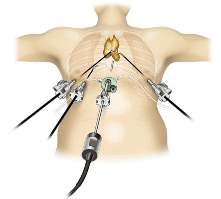 В целях профилактики малигнизации и развития компрессионного синдрома все опухоли средостения должны быть удалены как можно в более ранние сроки. Для радикального удаления опухолей средостения используются торакоскопический или открытый способы. При загрудинном и двустороннем расположении опухоли в качестве оперативного доступа преимущественно используется продольная стернотомия. При односторонней локализации опухоли средостения применяется передне-боковая или боковая торакотомия.