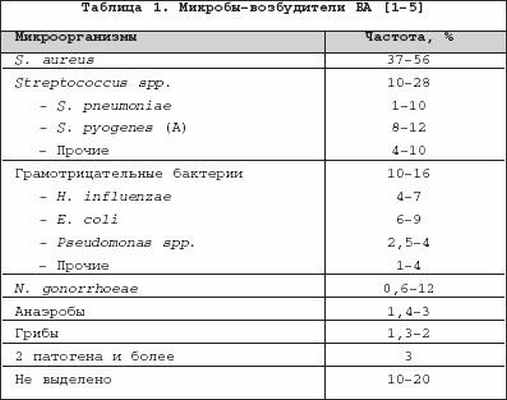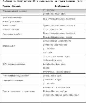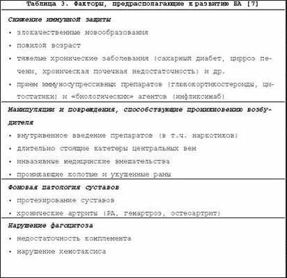 Бактериальный (септический) артрит (БА) представляет собой быстропрогрессирующую патологию, обусловленную непосредственной инвазией сустава гноеродными микроорганизмами 1 . Заболевание встречается повсеместно. Поражаются преимущественно дети и лица старше 60 лет. Ежегодная частота БА составляет 2–10 случаев на 100 000 населения , а среди больных ревматоидным артритом (РА) и реципиентов клапанных протезов эти значения достигают 30–70 на 100 000. Несмотря на обширный арсенал разработанных и внедренных в клиническую практику антимикробных средств и интенсивное развитие хирургической технологии, необратимая утрата функции сустава развивается у 25–50% больных. Частота летальных исходов при БА существенно не изменилась за последние 25 лет и составляет 5–15% [1]. Этиология Теоретически все известные бактерии могут вызвать БА (табл. 1). Самым распространенным этиологическим агентом БА является S. aureus , на долю которого приходится до 80% случаев инфекций суставов у больных РА и сахарным диабетом. Данный патоген также является основным при инфекционном коксите и полиартикулярных вариантах БА. На втором месте по частоте выделения у больных БА находятся стрептококки (в первую очередь, ? –гемолитический стрептококк группы А), которые, как правило, ассоциируются с фоновыми аутоиммунными заболеваниями, хронической инфекцией кожи и предшествующей травмой. Встречаемость S. pneumoniae в качестве возбудителя БА в последние годы существенно снизилась. Стрептококки других групп (B,G, C и F – в порядке убывания) выделяются при БА у больных с иммунной недостаточностью, злокачественными новообразованиями, а также инфекционной патологией пищеварительного и урогенитального тракта. Грамотрицательные палочки – причина БА у пожилых больных, наркоманов, вводящих наркотики внутривенно, а также у больных с иммунодефицитом. Анаэробы в качестве возбудителей БА чаще фигурируют у реципиентов суставных протезов, лиц с глубокими инфекциями мягких тканей и больных сахарным диабетом. Наиболее значимые этиологические агенты БА среди детей – S. aureus и Str . pyogenes . Роль H. influenzae , ранее встречавшейся достаточно часто при БА у детей, в последние годы значительноуменьшилась в связи с широким внедрением специфической вакцины. В то же время ряд исследователей отмечают рост встречаемости при БА грамотрицательной палочки K. kingae , являющейся нормальным обитателем ротовой полости у детей до 2 лет [6]. В таблице 2 суммированы данные о наиболее часто встречающихся возбудителях БА в зависимости от категорий больных. Патогенез В норме суставные ткани стерильны, что обеспечивается успешным функционированием фагоцитов синовиальной мембраны и синовиальной жидкости (СЖ). Для развития БА необходимо наличие ряда «факторов риска», зависящих как от состояния макроорганизма (в первую очередь – противоинфекционного иммунитета и суставного статуса), так и микроба–патогена (вирулентность, экспозиция, объем инокулята и т.д.). Основные факторы, предрасполагающие к развитию БА, представлены в таблице 3. Одним из наиболее значимых аспектов возникновения БА является ослабление естественных защитных сил макроорганизма, обусловленное сопутствующими заболеваниями, иммуносупрессией, возрастом пациентов. Немаловажное значение придается фоновой суставной патологии, проводимой терапии, а также возмож