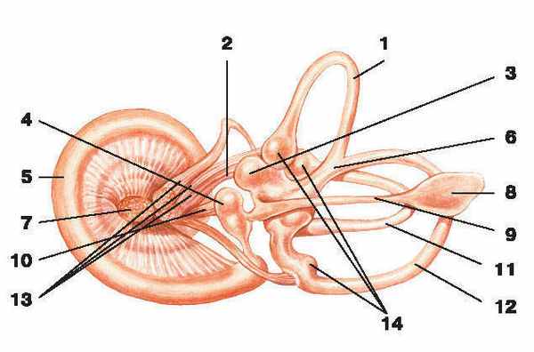 9 — эндолимфатический проток; 10 — нерв мешочка; 11 — боковой перепончатый поолукружный проток;