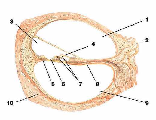 8 — спиральная костная пластинка; 9 — барабанная лестница; 10 — костная стенка улитки