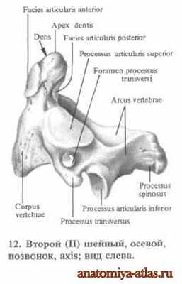Второй (II) шейный позвонок, или осевой позвонок, axis, имеет направляющийся вверх от тела позвонка зуб. dens, который оканчивается верхушкой, apex. Boкруг этого зуба, как вокруг оси, вращается атлант вместе с черепом.