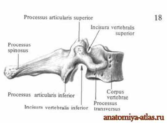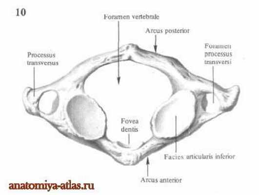 От общего типа шейных позвонков отличаются атлант, atlas, осевой позвонок, axis, и 7-ой выступающий позвонок, vertebra prominens. Первый шейный позвонок, атлант, atlas, не имеет тела и остистого отростка, а представляет собой кольцо, образующееся из двух дуг – передней и задней, arcus anterior et arcus posterior, соединённых между собой двумя более развитыми частями – латеральными массами, massae laterales. Каждая из них имеет сверху овальную вогнутую верхнюю суставную поверхность, facies articulares superior, — место сочленения с затылочной костью, а снизу почти плоскую нижнюю суставную поверхность, facies articularis inferior, сочленяющуюся со 2-ым шейным позвонком. Передняя дуга, arcus anterior, имеет на своей передней поверхности передний бугорок, tuberculum anterius, на задней — небольшую суставную площадку — ямку зуба, fovea dentis, сочленяющуюся с зубом шейного позвонка.