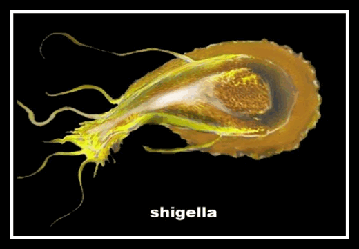 При прохождении по ЖКТ шигеллы сначала атакуют стенку тонкого кишечника, но среда для них там тоже не слишком благоприятная. Проникновения внутрь клеток не происходит, бактерии быстро погибают, поэтому симптомы поражения тонкой кишки обычно выражены незначительно и в большей степени обусловлены действием энтеротоксина.