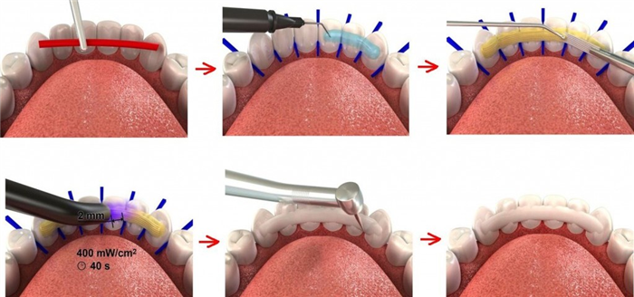 Шинирование зубов стекловолокном проводится в несколько этапов: