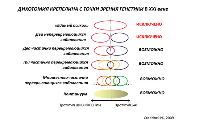 С точки зрения генетики, построение континуума "эндогенных психозов" (между шизофренией и биполярным аффективным расстройством) основано на том, что при этих состояниях есть определенная часть генетических особенностей, которая характерна только для шизофрении, часть, которая характерна только для биполярного расстройства, и еще часть, которая характерная для обоих этих заболеваний. Соответственно, генетики говорят о том, что четкое дихотомичное деление Э.Крепелина на шизофрению и МДП было ошибочным. Также, как и представления об "едином психозе" Гризингера. Зато другие варианты концептуализации эндогенных психозов, в т.ч. с выделением третьего расстройства (шизоаффективного), или нескольких переходных форм, или непрерывного континуума - возможны.