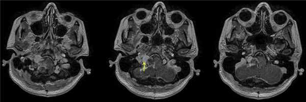 При проведении МРТ головного мозга пациентки В. на 3-и сутки после операции выявлена остаточная часть опухоли в канале подъязычного нерва (рис. 5). Рис. 5. МРТ головного мозга пациентки В. на 3-и сутки после операции. При усилении сигнала парамагнетиком определяется остаток опухоли в канале подъязычного нерва справа (указано стрелкой).
