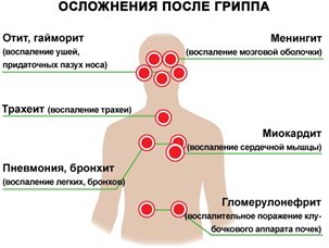 По данным российских и зарубежных исследователей, все осложнения гриппа можно разделить на две группы: состояния, непосредственно обусловленные действием вируса гриппа (например, вирусное поражение легких, отек головного мозга и т.д.), а также вторичные осложнения гриппа, к числу которых относится и декомпенсация сопутствующих хронических заболеваний (обострение бронхиальной астмы, хроническая обструктивная болезнь легких, хроническая сердечная недостаточность, заболевания печени, почек и т.д.).