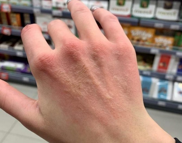 - Кислотой. Тяжелые повреждения выявляются при действии сильных кислот (pH менее 2). Соединения вызывают сворачивание (коагуляцию) белка, образуется сухой кожный струп, препятствующий проникновению агента вглубь тканей, поэтому травмы обычно неглубокие.