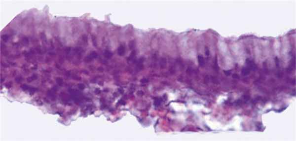 Рис. 2. Оболочка кисты Торнвальдта. Внутренняя стенка выстлана призматическими клетками. Fig. 2. The e nvelope of Thornwaldt’s cyst. The inner wall is lined with prismatic cells.Окраска гематоксилином и эозином. Ув. 400. Staining with hematoxylin and eosin, x400.