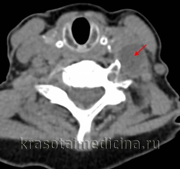 КТ шеи. Слева от средней линии в сонном пространстве кистозное образование (кистозно измененный лимфоузел).