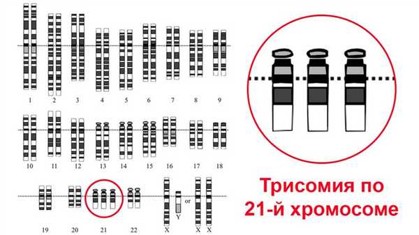 - трисомия – наиболее распространенная форма синдрома Дауна, для которой характерно полное утроение 21 хромосомы во всех клетках организма; на долю этой формы приходится 94-95% всех случаев болезни;
