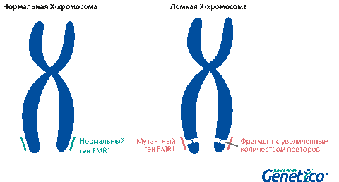 Так называемая «ломкость» X-хромосомы проявляется в том, что хромосома выглядит нетипично при специальном окрашивании, как будто один кусок отделился, хотя физически она остается цельной. Генетическая основа этого явления заключается в увеличении числа тринуклеотидных повторов CGG в гене FMR1, расположенном на X-хромосоме.