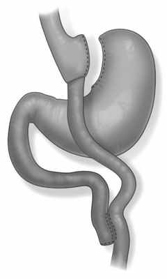 Операция гастрошунтирования применяется у лиц, страдающих тяжелыми формами ожирения, и представляет собой безопасный и эффективный способ борьбы с лишней массой тела. Суть операции заключается в следующем: желудок пересекают таким образом, что формируется часть объемом 30—50 мл, к ней подводится дистальная часть тонкой кишки. Большая часть желудка не удаляется, его секрет вместе с соком поджелудочной железы и желчными кислотами поступает по другой петле и смешивается с пищей. Исходя из этого становится очевидным, что эффективность данной операции заключается в смешанном типе действии: присутствует и рестриктивный компонент (объем желудка составляет всего 30—50 мл) и принцип мальабсорбции (пища минует большую часть тонкой кишки, где происходит всасывание жиров и углеводов).