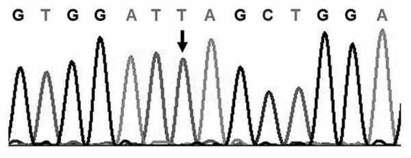 При секвенировании гена FOXP3 у ребенка выявлена гемизиготная трансверсия c.1228G>T в экзоне 11, что приводило к замене кодона глутаминовой кислоты (GAG) на стоп-кодон (TAG) в положении 410 (p.E410X) (см. рисунок, а). Рисунок 1. Результаты генетического исследования. а - фрагмент последовательности экзона 11 гена FOXP3 у пациента. Гемизиготная трансверсия c.1228GмT (отмечена стрелкой) в экзоне 11 с заменой кодона глутаминовой кислоты (GAG) на стоп-кодон (TAG) в положении 410 (p.E410X) У матери ребенка данная мутация была выявлена в гетерозиготном состоянии (см. рисунок, б). Рисунок 2. Результаты генетического исследования. б - гетерозиготная мутация в том же положении (отмечена стрелкой) у матери пациента. Данная мутация описывается впервые.