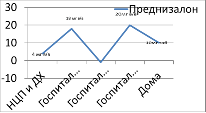 В отделении ребенку проводилась симптоматическая терапия, назначался 6-меркаптопурин. На фоне приема 6-меркаптопурина отмечалась некоторая положительная динамика — снизился лейкоцитоз, начала сокращаться в размерах селезенка, однако присоединились диспептические осложнения (снижение аппетита, частая рвота, неустойчивый стул), в связи с чем препарат отменен. С 18.12.2014 г. начата терапия преднизолоном 1,5мг/кг/сут. В динамике состояние стабилизировалось, девочка стала активней, начала прибавлять в весе, увеличился объем активных движений. Однако размеры паренхиматозных органов прежние. На фоне терапии отмечался периодически субфебрилитет, неустойчивый стул, стоматит, присоединились явления двухсторонней пневмонии. Получала антибактериальную, противогрибковую терапию, постоянно пробиотики, ферментотерапию. В динамике состояние стабилизировалось. Выписывалась под наблюдение участкового педиатра и гематолога по месту жительства с рекомендациями повторной госпитализации. Госпитализирована планово.