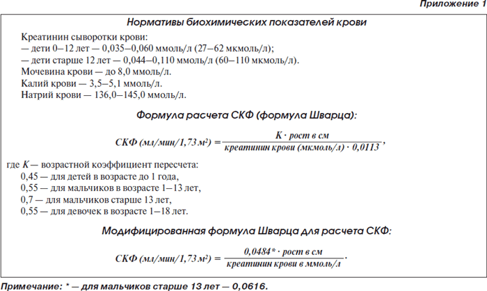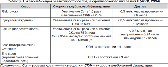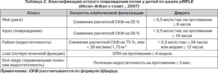 Принципы стратификации тяжести острого повреждения почек у взрослых отражены в шкале RIFLE (табл. 1), которой можно пользоваться и при лечении детей старшего возраста. В то же время для детей разработана педиатрическая модификация степеней тяжести острого повреждения почек (табл. 2).
