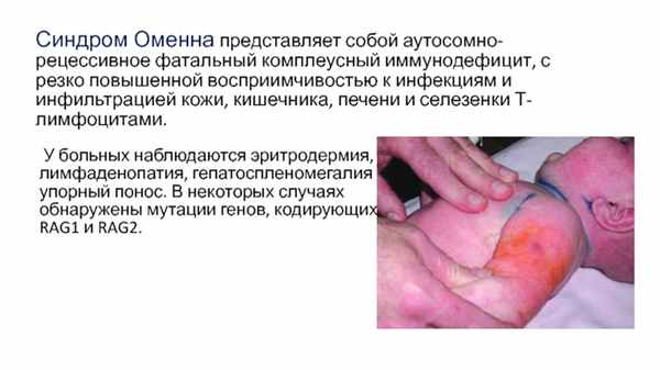 Синдром Оменна представляет собой аутосомно-рецессивное фатальный комплеусный иммунодефицит, с резко повышенной восприимчивостью к инфекциям и инфильтрацией кожи, кишечника, печени и селезенки Т-лимфоцитами.
