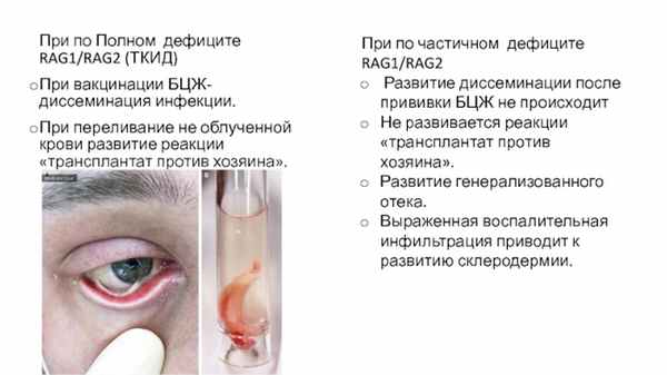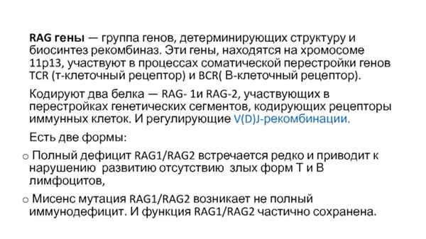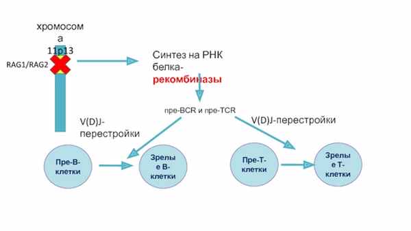Полный дефицит RAG1/RAG2 встречается редко и приводит к нарушению развитию отсутствию злых форм Т и В лимфоцитов,