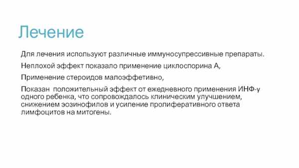 Показан положительный эффект от ежедневного применения ИНФ-y одного ребенка, что сопровождалось клиническим улучшением, снижением эозинофилов и усиление пролиферативного ответа лимфоцитов на митогены.
