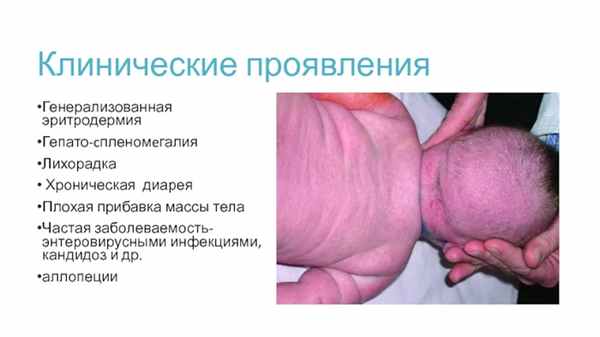 2. У больных наблюдаются эритродермия, лимфаденопатия, гепатоспленомегалия и упорный понос. В некоторых случаях обнаружены мутации