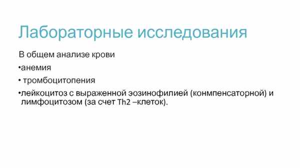 лейкоцитоз с выраженной эозинофилией (конмпенсаторной) и лимфоцитозом (за счет Th2 –клеток).