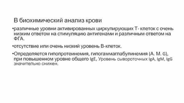 | Критериями диагноза для всех форм ТКИД являются гипоплазия лимфоидной ткани, лимфопения, выраженное снижение уровня CD3+-клеток, значительное уменьшение концентраций сывороточных иммуноглобулинов, раннее начало тяжелых инфекций. |