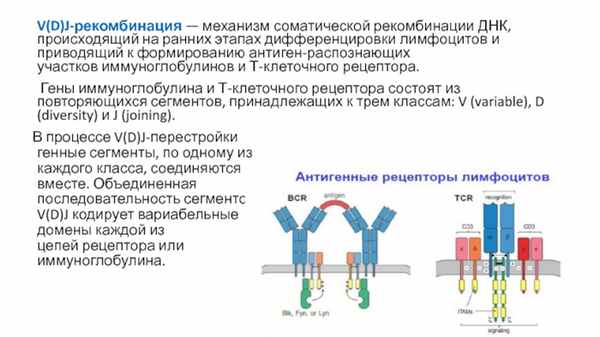 Гены иммуноглобулина и Т-клеточного рецептора состоят из повторяющихся сегментов, принадлежащих к трем классам: V (variable), D (diversity) и J (joining).
