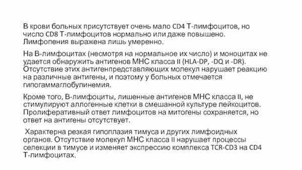 На В-лимфоцитах (несмотря на нормальное их число) и моноцитах не удается обнаружить антигенов МНС класса II (HLA-DP, -DQ и -DR). Отсутствие этих антигенпредставляющих молекул нарушает реакцию на различные антигены, и поэтому у больных отмечается гипогаммаглобулинемия.