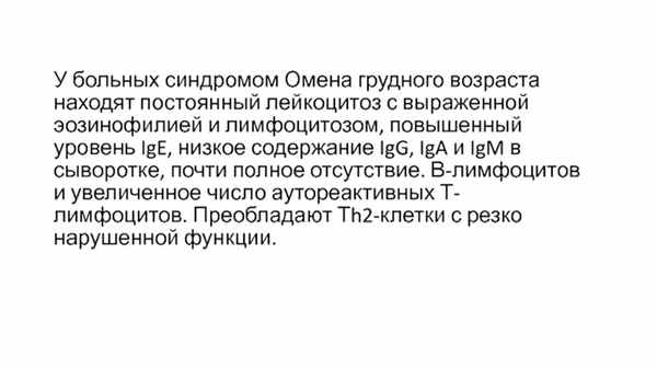 У больных синдромом Омена грудного возраста находят постоянный лейкоцитоз с выраженной эозинофилией и лимфоцитозом, повышенный уровень IgE, низкое содержание IgG, IgA и IgM в сыворотке, почти полное отсутствие. В-лимфоцитов и увеличенное число аутореактивных Т-лимфоцитов. Преобладают Тh2-клетки с резко нарушенной функции.
